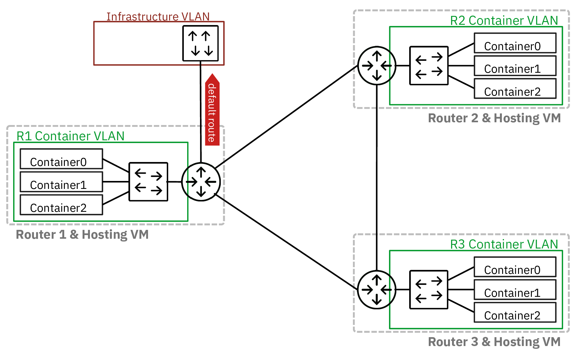 On s'appuie sur le support Routage Inter-VLAN pour constituer une topologie physique à base de réseaux locaux virtuels ou VLANs. On fait correspondre à chaque lien de la topologie logique en triangle un numéro de VLAN défini.